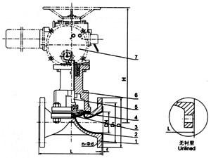 部件列表:1.閥體 2.閥體襯里 3.隔膜 4.閥瓣 5.閥桿 6.閥蓋 7、電動頭