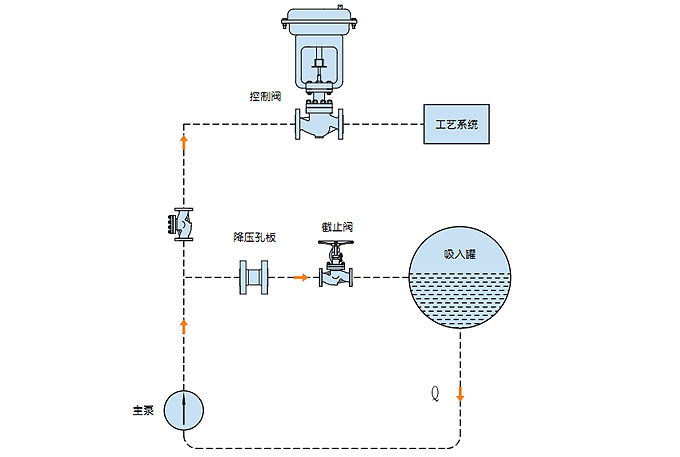 連續(xù)循環(huán)系統(tǒng)泵的最小需求流量與系統(tǒng)的工藝流量變化無關(guān)。最小流量設(shè)定好后經(jīng)過減壓孔板直接回流至儲(chǔ)罐,連續(xù)的最小流量循環(huán)雖然可以很好的保護(hù)泵,但是必須泵提供更大輸出功率以保證系統(tǒng)工藝流量加上再循環(huán)流量,造成額外的能源浪費(fèi)。